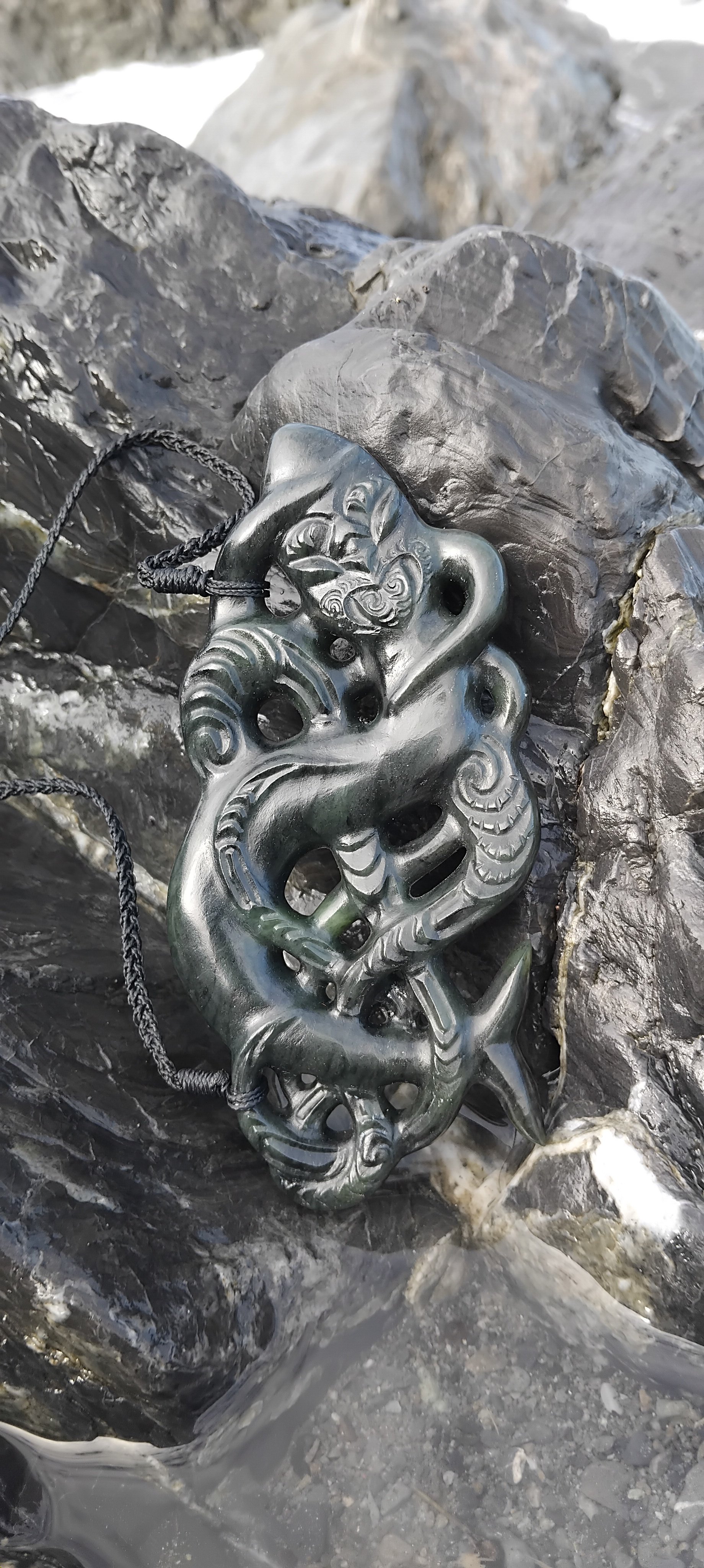 Tai Tokerau style Marakihau Taniwha with kirikiore unaunahi, carved from dark Southwestland Kawakawa Pounamu from Ka Umu o Hapopo.