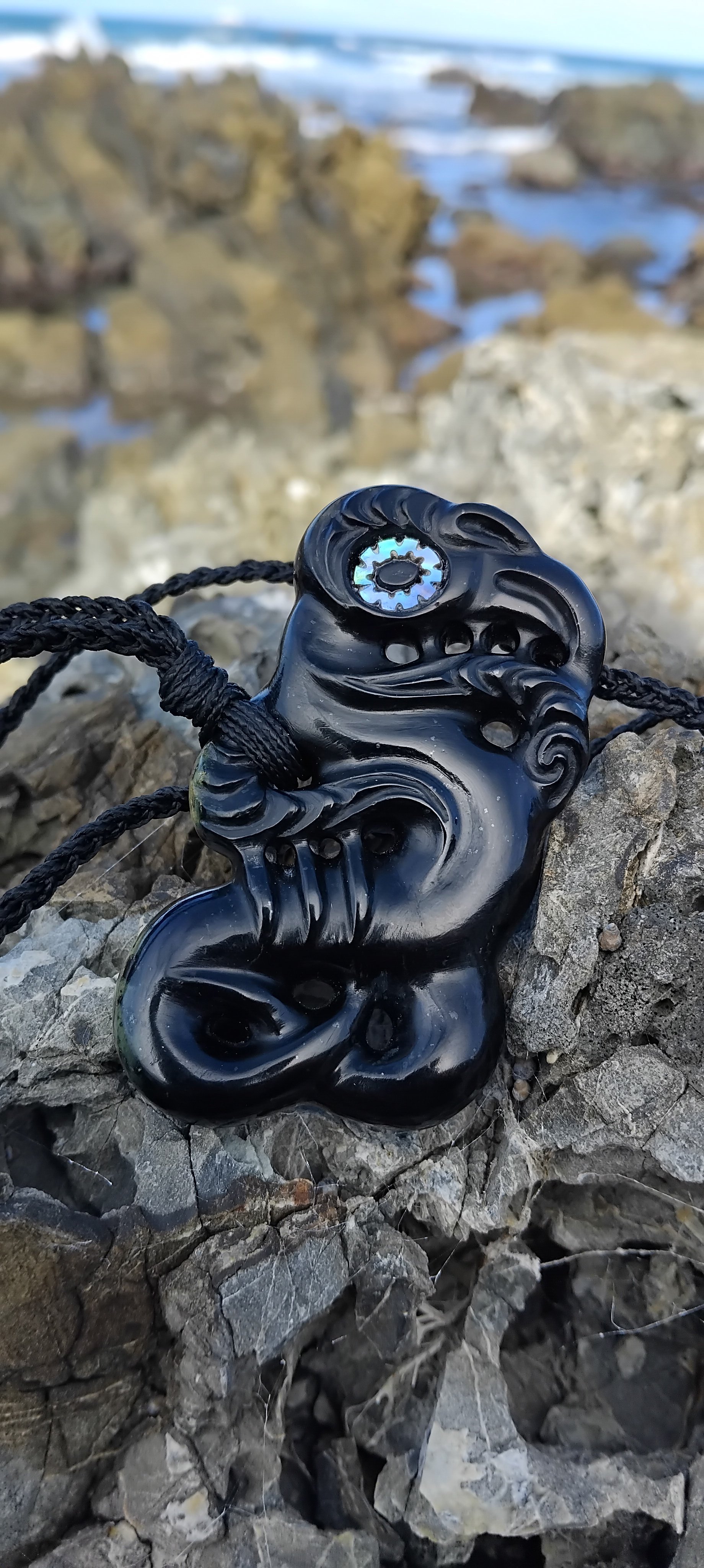 Manaia with Kirikiore and paua inlay, carved from dark Tai Tapu Tangiwai (Williamsite), collected by the carver in East Takaka.