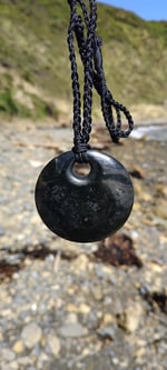 Porowhita from dark, glassy and highly translucent Southwestland Tangiwai Pounamu, collected by Kati Mamoe whanau. The disc can be particularly associated with Hina.
